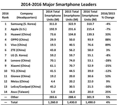 根据2014年至2016年的统计数据显示,苹果、三星在智能手机市场上仍是最大的两家公司。去年这两家公司的智能手机出货量达到了5.26亿台,占到了全球市场35%的比例。虽然出货货和占比非常之高,但从2015年开始,这两家公司的全球占比同比却下滑了4%。