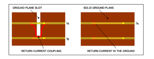 直流电流总是倾向于沿着低阻通路流通。同理,高频电流也是优先流过最低电阻的通路。所以,对于地层上方的标准PCB微带线,返回电流试图流入引线正下方的接地区域。按照上述引线耦合部分所述,割断的接地区域会引入各种噪声,进而通过磁场耦合或汇聚电流而增大串扰(图9)。