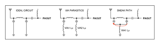 寄生电感往往对旁路电容的连接影响很大。理想的旁路电容在电源层与地层之间提供高频短路,但是,非理想过孔则会影响地层和电源层之间的低感通路。典型的PCB过孔(d = 10 mil、h = 62.5 mil)大约等效于一个1.34nH电感。给定ISM-RF产品的特定工作频率,过孔会对敏感电路(例如,谐振槽路、滤波器以及匹配网络等)造成不良影响。