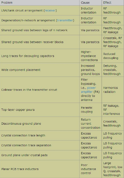本文罗列了各种不同的设计疏忽,探讨了每种失误导致电路故障的原因,并给出了如何避免这些设计缺陷的建议。本文以FR-4电介质、厚度0.0625in的双层PCB为例,电路板底层接地。工作频率介于315MHz到915MHz之间的不同频段,Tx和Rx功率介于-120dBm至+13dBm之间。表1列出了一些可能出现的PCB布局问题、原因及其影响。