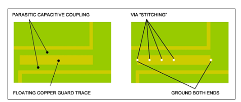 填充地也称为保护线,通常将其用于电路中很难铺设连续接地区域或需要屏蔽敏感电路的设计(图10)。通过在引线两端,或者是沿线放置接地过孔(即过孔阵列),增大屏蔽效应8。请不要将保护线与设计用来提供返回电流通路的引线相混合,这样的布局会引入串扰。